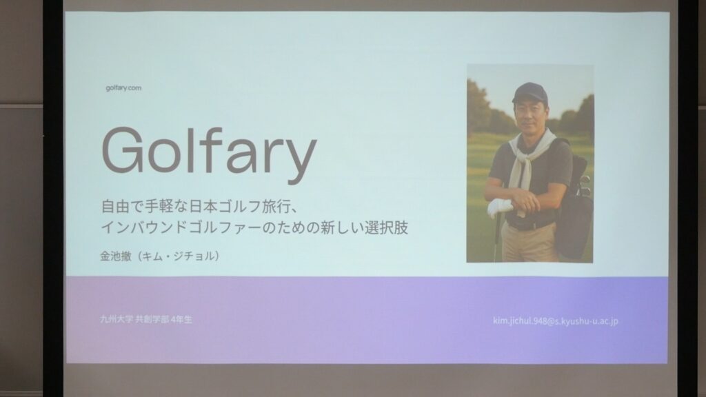 アジア随一のゴルフ大国・日本への旅行を、AIを活用して最適化する旅行プラットフォームを提案。韓国からの留学生を中心としたチームによる発案で、旅行会社勤務の父親の姿から着想を得たとのこと。旅行設計から予約、交通手配まで一括でサポートします優秀賞を受賞しました!