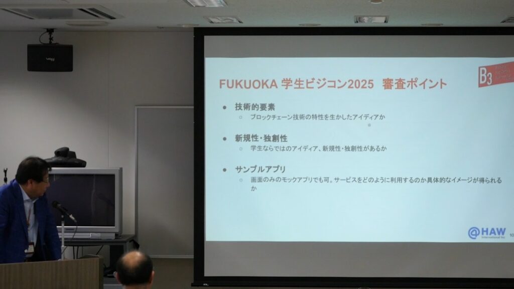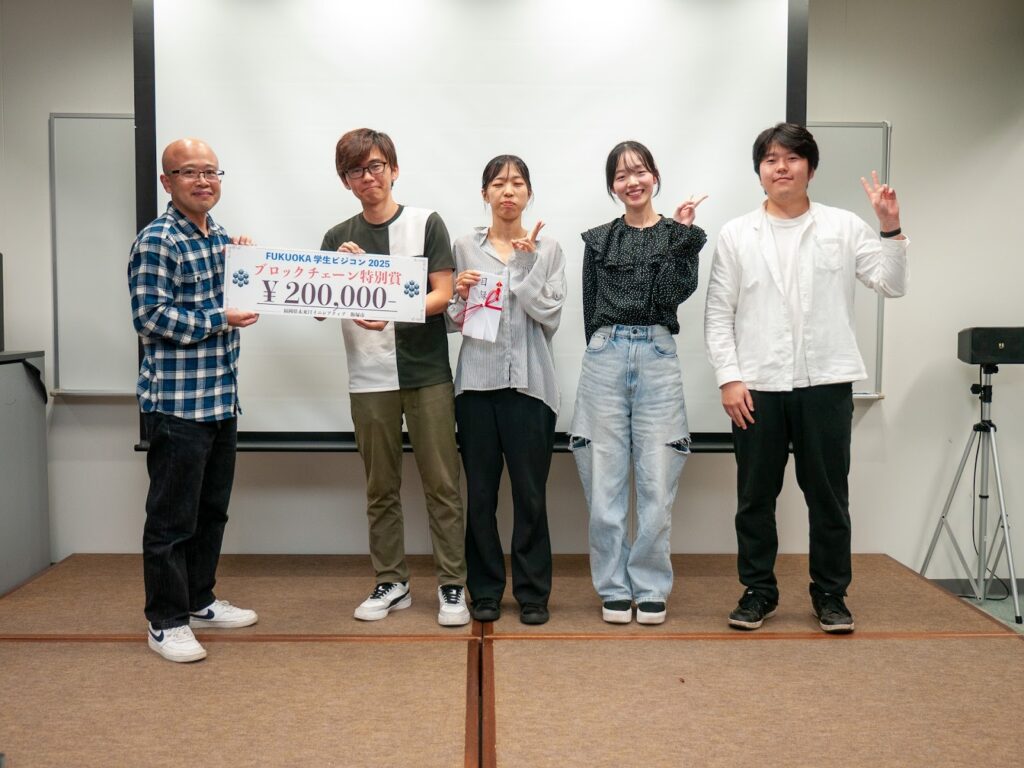 このビジネスコンテストは、ブロックチェーン、AI、クラウドの先端技術を活用したビジネスプランを競うもので、福岡県内の大学生によるチームが参加しました。